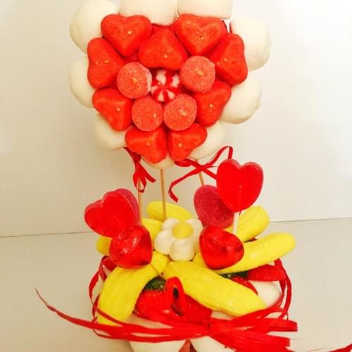 Nubes blancas, nubes de corazón , tortitas Vidal , 2 piruletas de corazón, plátanos de nube, margarita de nube, fresa salvaje de brillo, lenguas de fresa, dos corazones de chocolate .